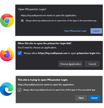 Press the Steam sign-in button to open a webpage where you will need to login to Steam in order to proceed. You will be then asked by your web browser to allow the PR Launcher to login. Depending on your browser this will look similar to the images below. Press the button that allows you to proceed. Afterwards you can close the webpage.