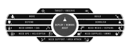 Pemimpin squad dapat menggunakan radio untuk meminta bantuan kepada squad lain. Dengan cara ia haru menyalakan radio lalu tekan tombol secondary radio/radio sekunder (T). Ini akan membuka menu untuk meminta bantuan dan mengirimkan aset-set tim. 5 perintah dari bawah yang diawali “NEED ...” akan menempatkan marka pada map sesuai posisi Anda. Perintah-perintah tersebut nantinya akan disampaikan sebagai pesan radio pada tim Anda untuk memberitahu satu tim mengenai permintaan tersebut. Permintaan bantuan “NEED AREA ATTACK” berbeda dengan yang lainnya. Dalam sebagian map, pasukan konvensional dapat menggunakan perintah ini untuk meminta bantuan serangan artileri. Jika permintaan ini diterima komandan satu tim, serangan tersebut akan sampai sekitar satu menit. Setelah loading map baru atau mengeksekusi area attack,butuh waktu 30 menit untuk tersedia lagi. Di sisi yang bersamaan, tim insurgent/militia memiliki akses serangan mortir setiap 20 menit di kebanyakan map.